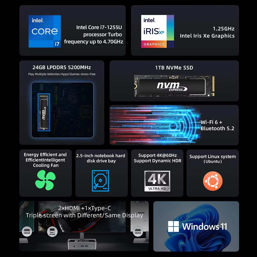 ♡Szybki podglądBMAX B11 Power Mini PC Intel Core Ultra 7 155H 24 GB LPDDR5 4400MHz RAM 1 TB SSD Windows 11 Pro WiFi 6 Bluetooth 5.2 HDMI typu C2566.99 PLNPLN 3130.48Gorące
