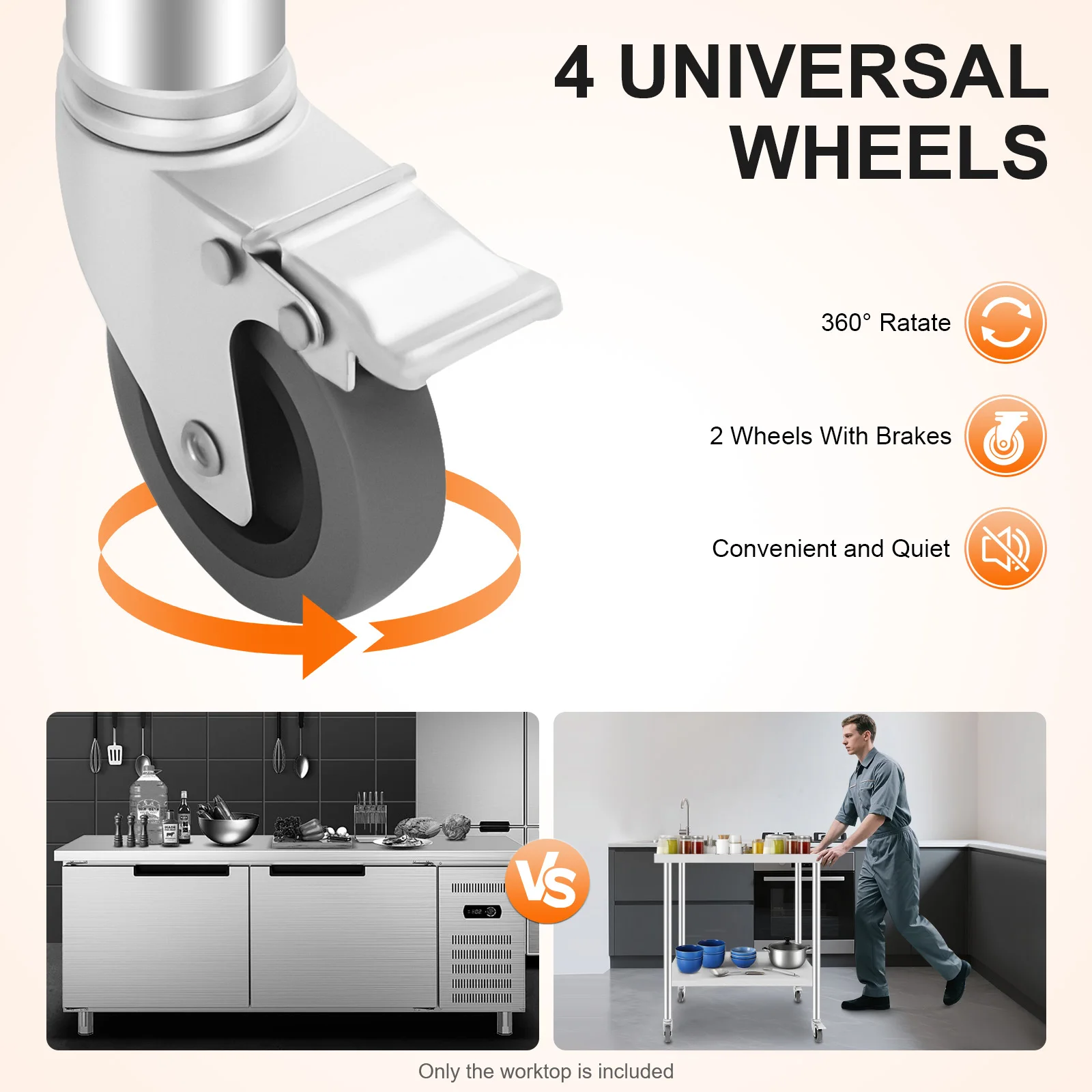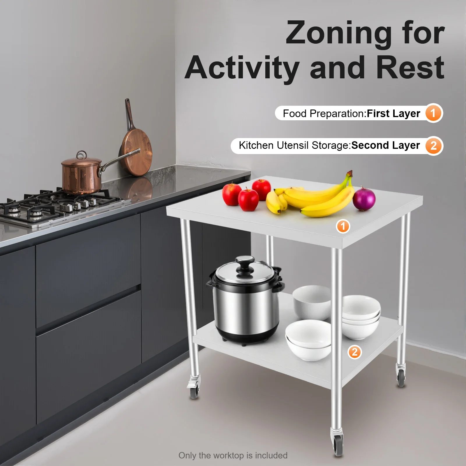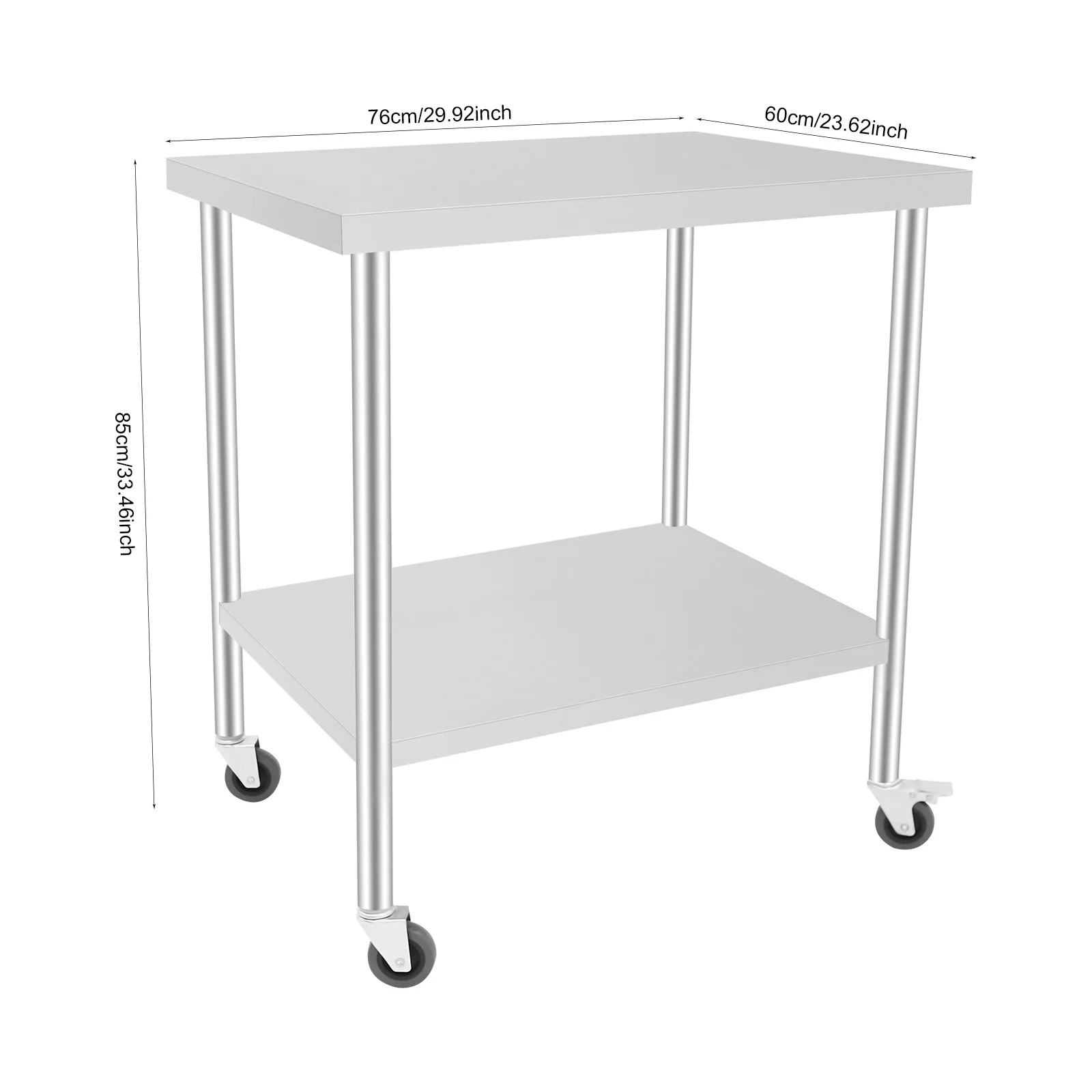 Stół roboczy ze stali nierdzewnej z kółkami, dwupoziomowy stół do przygotowywania potraw o udźwigu 300 kg, stal nierdzewna 201 do kuchni restauracji, 76x60 cm - TopDealBox