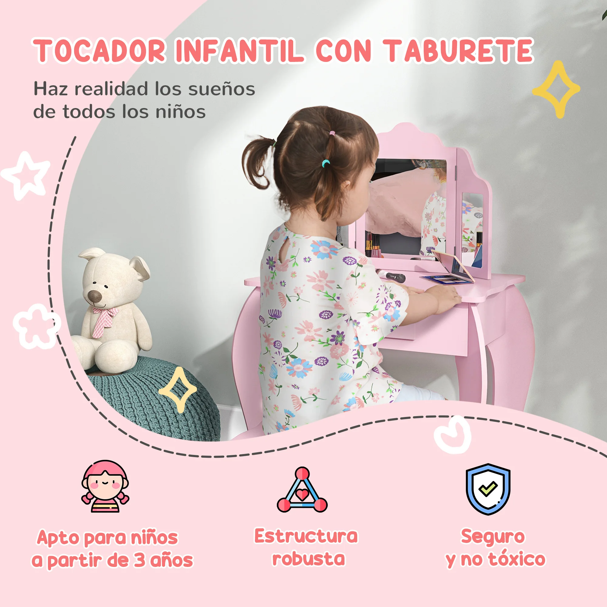♡Szybki podglądToaletka dziecięca Homcom ze stołkiem i lustrem, styl księżniczki, różowa drewniana toaletka do makijażu, zabawka dla dziewczynek, 60X34X93 cm332.99 PLNGorące★★★★★5.0