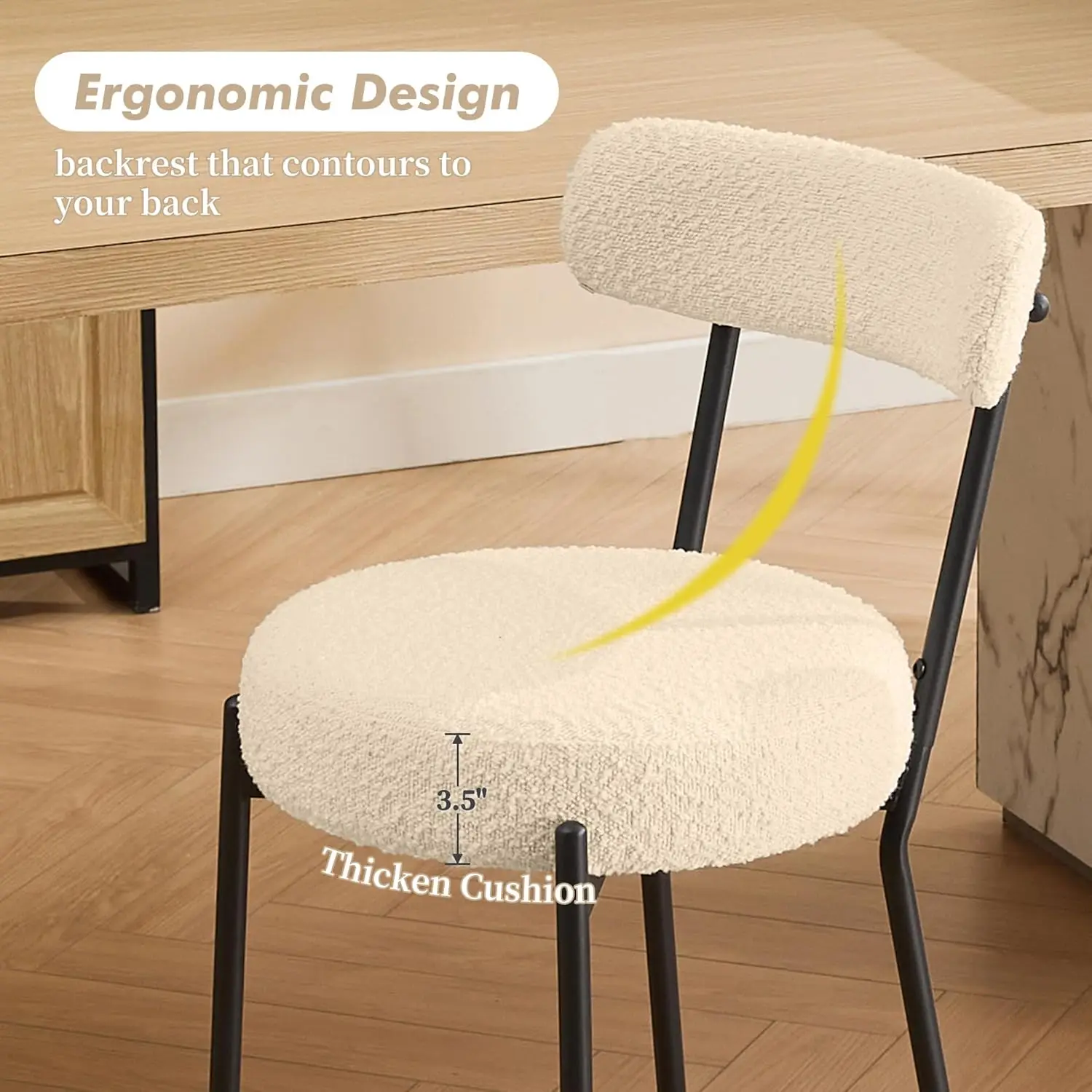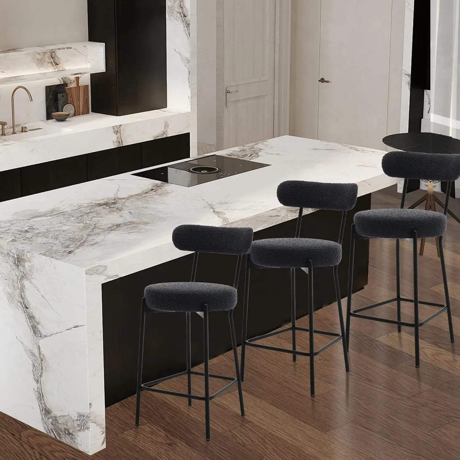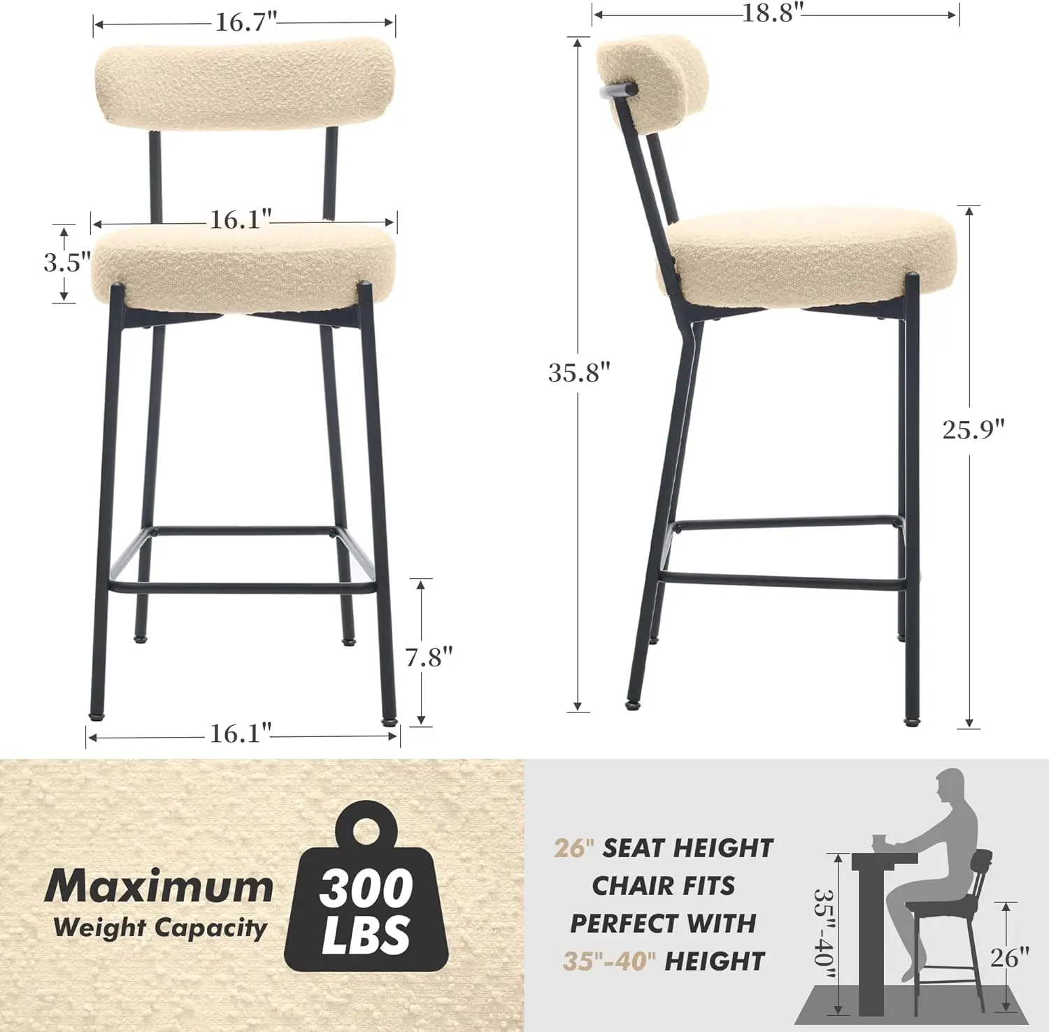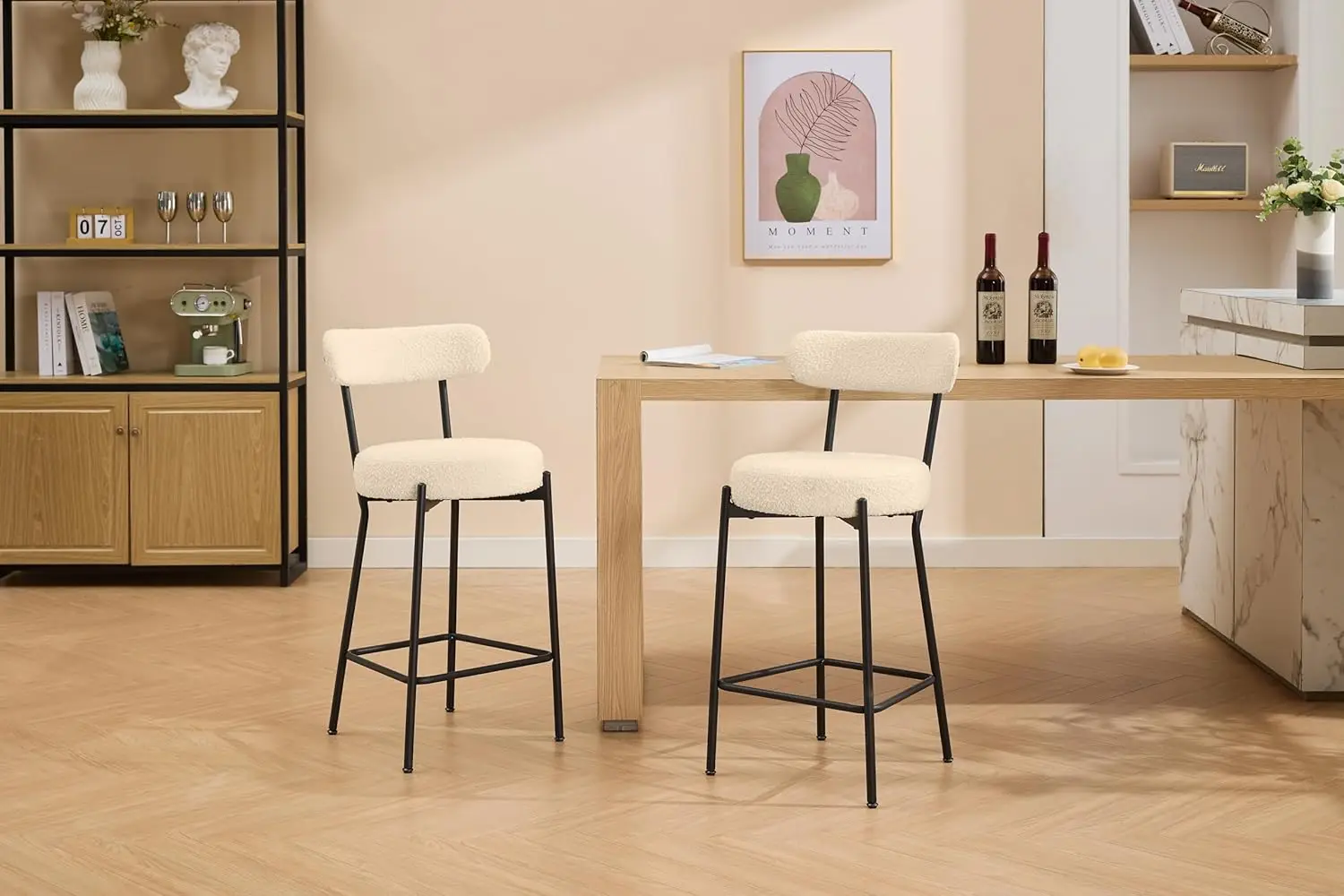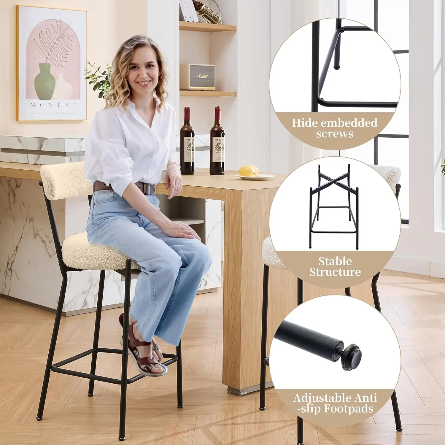 Zestaw 2 stołków barowych, 26 cali, stołki barowe z oparciem z tkaniny boucle, tapicerowane w stylu mid-century modern, z metalowymi nogami do wyspy kuchennej. - TopDealBox